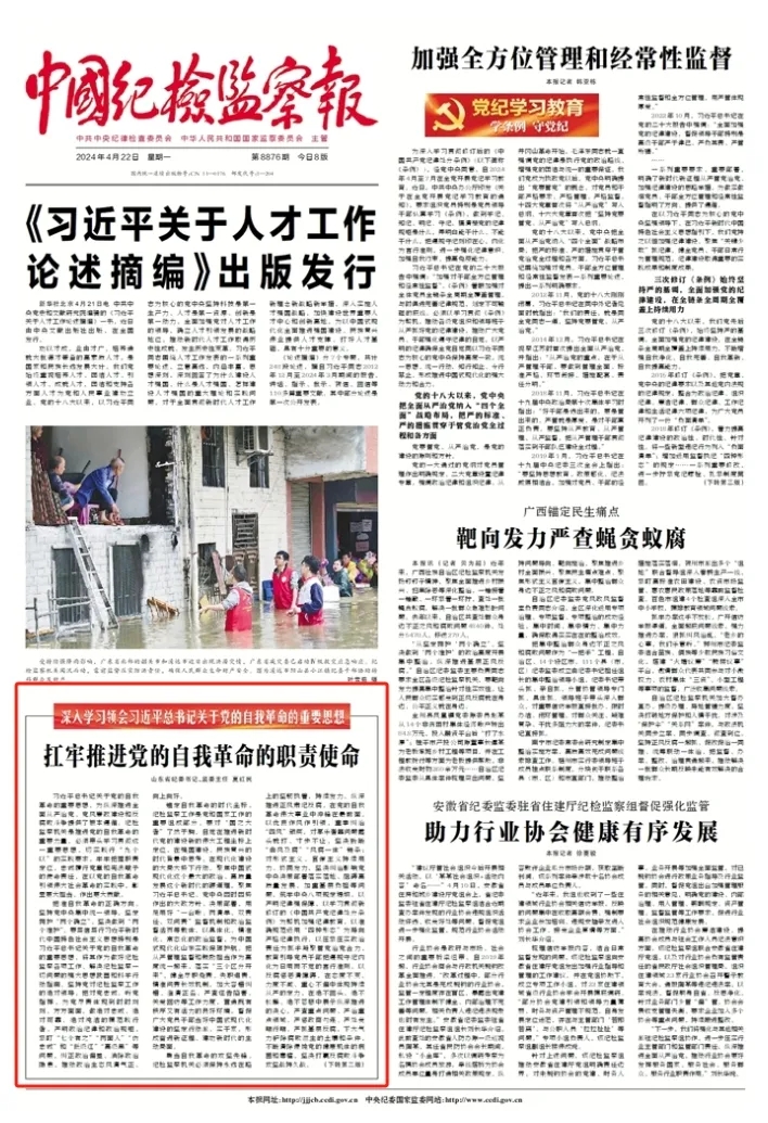 2024年4月22日,《中国纪检监察报》头版、中央纪委国家监委网站头条刊发山东省委常委、省纪委书记、省监委主任夏红民署名文章《扛牢推进党的自我革命的职责使命》。